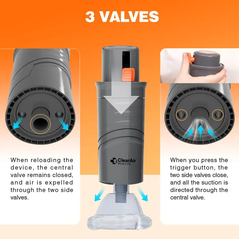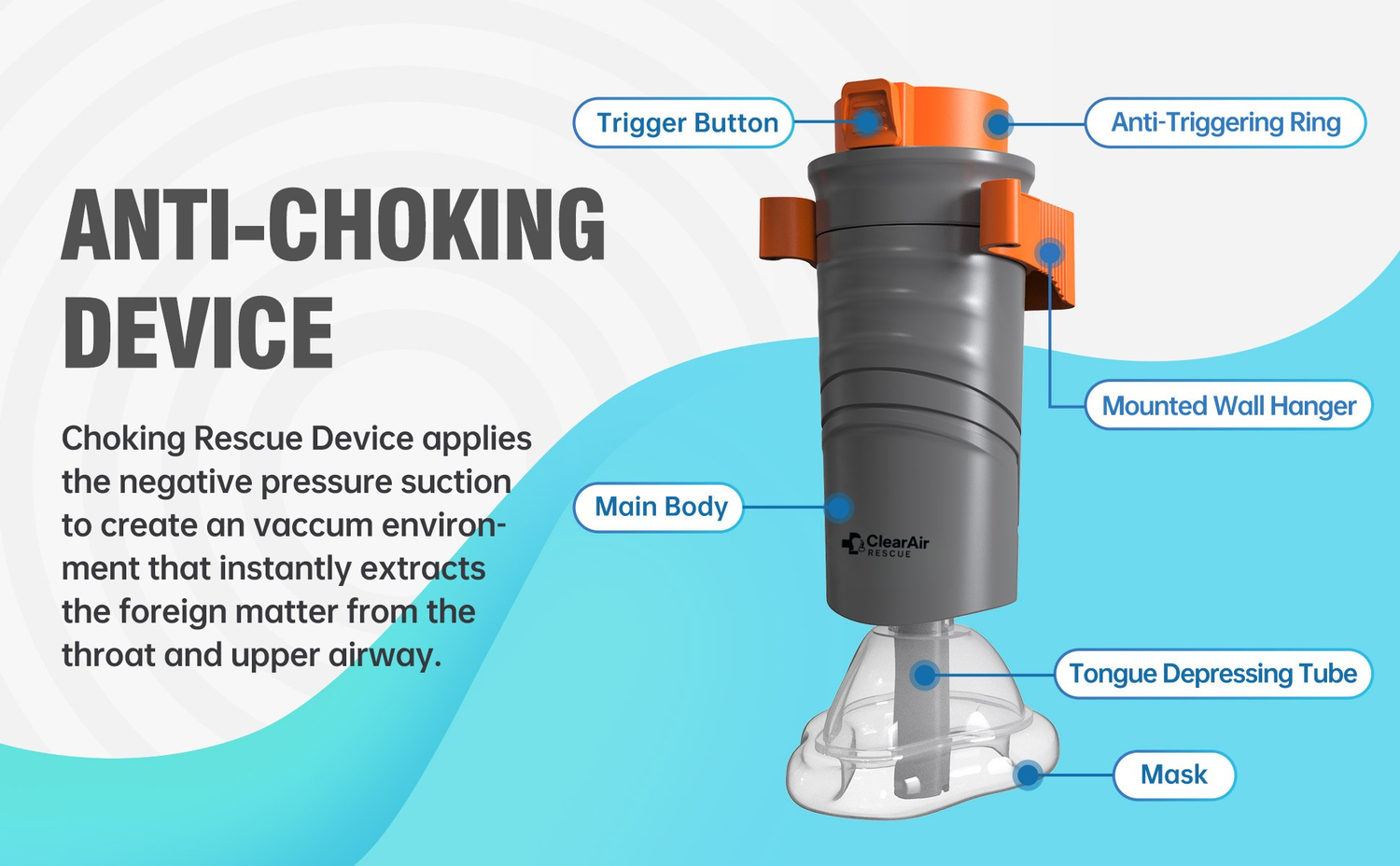The ClearAir Rescue Anti-Choking Device uses negative pressure suction to instantly remove blockages from the throat. With the push of a button, it creates a vacuum to extract foreign objects, providing rapid relief in choking emergencies. Designed for easy access and safety, it ensures effective, life-saving action when every second counts.